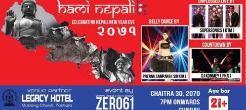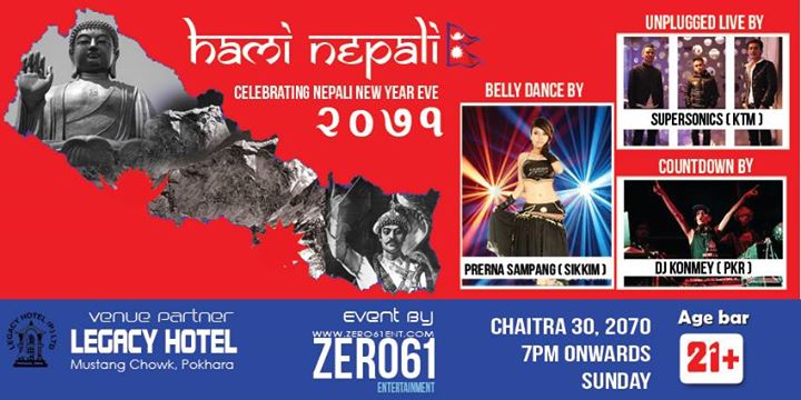 CELEBRATING NEPALI NEW YEAR EVE 2071 UNPLUGGED LIVE BY : SUPERSONICS - FROM KTM (7 pm to 9:30pm) BELLY DANCE BY : PRERNA SAMPANG - YOUNGEST BELLY DANCER FROM SIKKIM ( 9:30 pm to 10 pm) COUNTDOWN BY : DJ KONMEY - FROM PKR (10 pm t0 2 pm) ENTRANCE: Rs. 1500 /- [ INCLUDING Legacy Hotel..