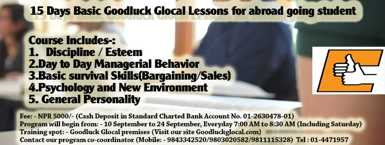 Fee: - NPR 5000/- (Cash Deposit in Standard Charted Bank Account No. 01-2630478-01) Program will begin from: - 10 September to 24 September, Everyday 7:00 AM to 8:30 AM (Including Saturday) Training spot: - Goodluck Glocal premises (Visit our site Goodluckglocal.com) Contact our program co-coordinator (Mobile: - 9843342520/9803020582/9811115328) Tel : 01-4471957
