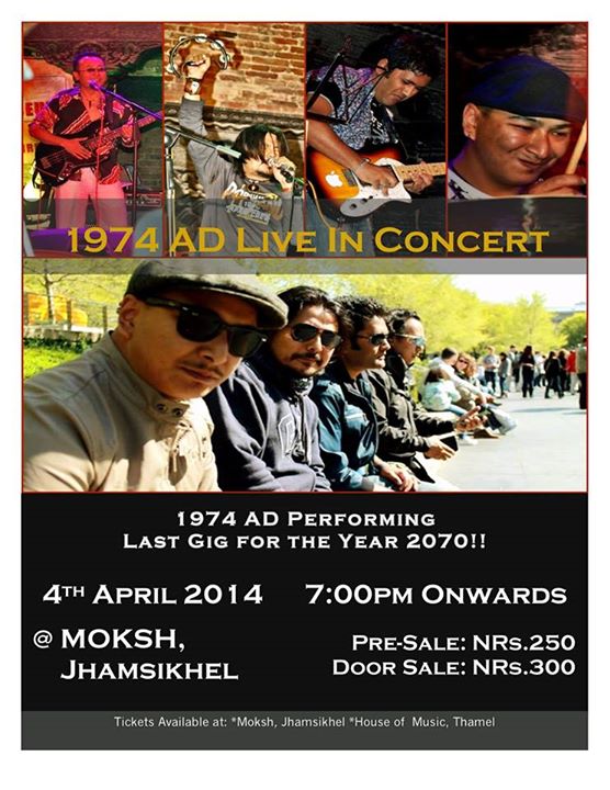 1974 AD Performing Last Gig for the Year 2070 !! When? 4th April 2014 Time? 7:00pm Onwards /- Where? at Moksh, Jhamsikhel. Tickets: Pre-Sale: NRs.250 Door Sale: NRs.300 (tickets available at *Moksh, Jhamsikhel & *House of Music, Thamel) Hope to see you all there !!..
