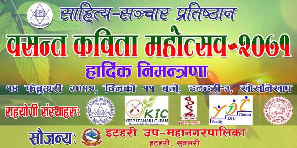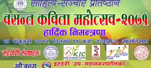 मिति २०७१ फाल्गुन २ गते शनिबार भ्यालेन्टाइन डे का दिन बिहान ११ बजे देखि खोर्सानेखाप को मैदान मा प्रख्यात कवि प्राज्ञ श्रवण मुकारुङ को प्रमुख आतिथ्य र पुर्वान्चल मा रहनु भएका विशिष्ट कवि ज्यु हरु को आतिथ्य मा हुन गैरहेको " वसन्त कविता महोत्सव २०७१" मा यहाँ हरु सबैलाइ निमन्त्रणा ।।।।