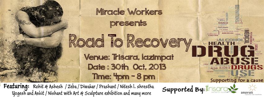 'Miracle Workers' is a group of undergraduates working on a 10 days project in order to spread awareness on Drug Abuse and it's consequences. It presents a fun gig for the better. Featuring Rohit John Chettri & Ashesh Kulung Rai, Dwahcar Raii,Zeba Shah , Nitesh Lal Shrestha, Prashant Manandhar, Yogesh & Enkit Shrestha andNishant Pradhan followed by art & sculpture exhibition. It is a fund raiser event that stands for a cause i.e., ' Fight addiction with music'.