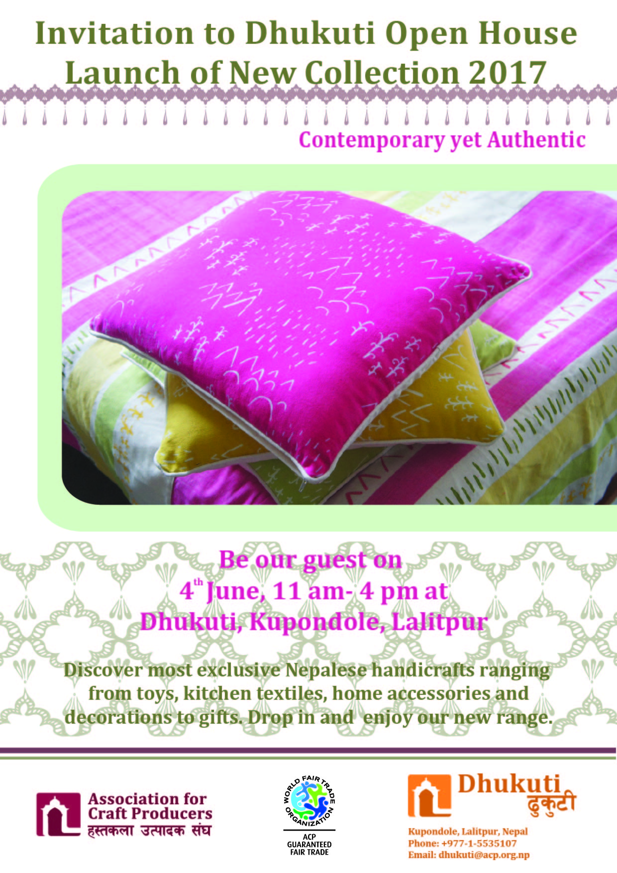 We cordially invite you to the exclusive launch of our New Product Collection 2017 on June 4th, 2017 Sunday at Dhukuti premises from 11 am till 4 pm. Please honor us with your presence and explore an exciting range of products from textiles, copper, ceramics, f..
