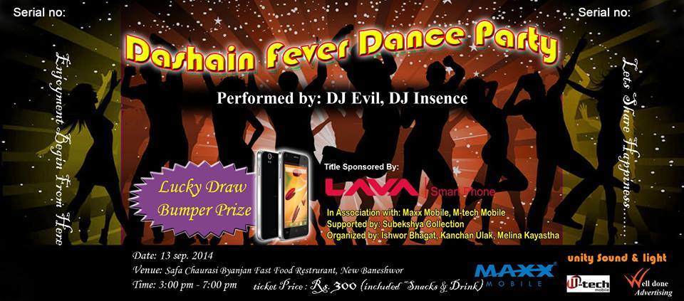 DASHAIN FEVER DANCE PARTY Date: 13 Sep, 2014 (Saturday) Venue: Safa Chaurasi Byanjan Fast Food Resturant (New-Baneshwor) Time: 3pm To 7pm Tickets Price : 300 (Included Snacks and Drinks) PRIZE: Lucky Draw Bumper Prize : LAVA IRIS X1 Lucky Draw 2nd Prize : M-Tech Mobile Lucky Draw 3rd Prize : M-Tech Mobile, Gift Hampers and Many More. FOR BOOKING 9842837224, 9849216702, 9849333405