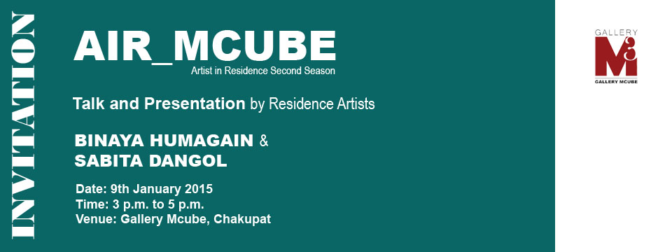 INVITATION AIR_MCUBE Local cordially invites you to Talk and Presentation by Residence Artists Binaya Humagain & Sabita Dangol Date: 9th January 2014 Time: 3 to 5 P.M. Venue: Gallery Mcube, Chakupat, Lalitpur, Nepal Please reserve your Chakati in advance for further information contact Galler..