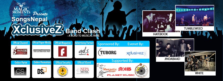 All Nepal Band Competition : SongNepal XclusiveZ Band Clash Grand Finale Battle: 5th, 6th October, 2012 Venue: Fun Park, Bhrikuti Mandap, Kathmandu GUEST BANDS: ~ Hatebook ~ Tumbleweed ~ White ~ Jindabaad..