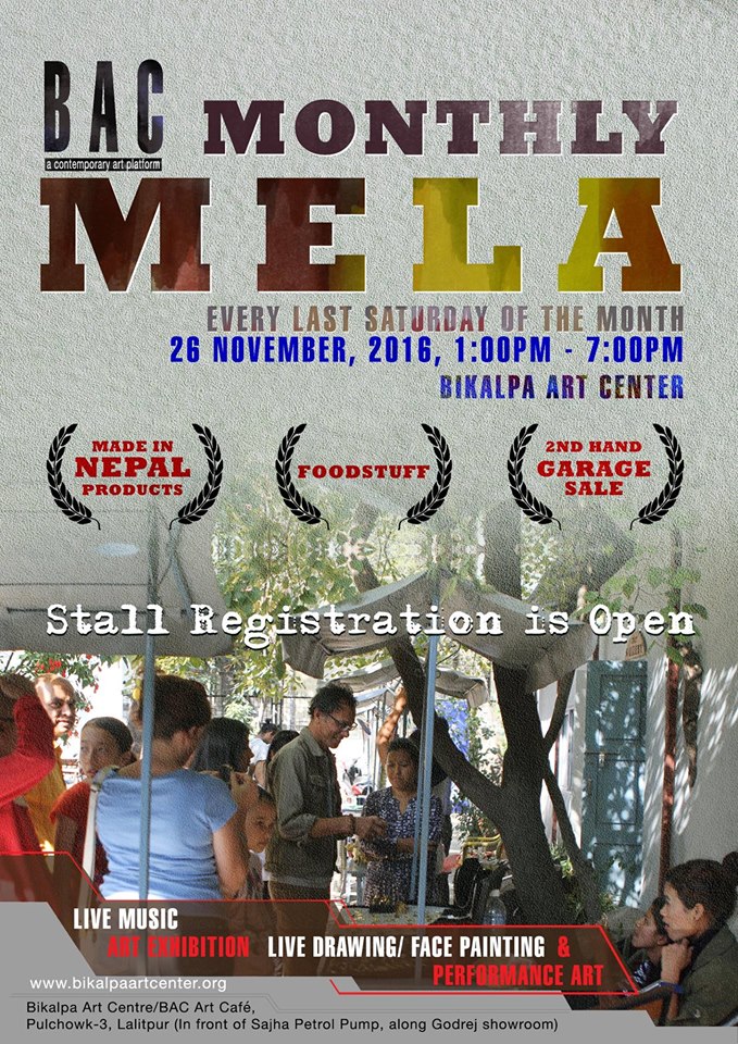On Saturday 26th November, 2016 the Bikalpa Art Center (BAC)/ BAC ART CAFE will turn into a Festive Mela place again, the BAC's Monthly Market. The Mela will showcase i.) Made in Nepal products ii.) Local food and drinks and iii.) Second hand garage sale.