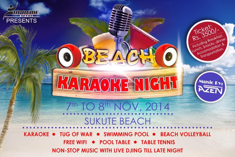 Karaoke night in SUKUTE BEACH on 7th November 2014. The package includes Snacks, Dinner, Breakfast, Lunch, Accommodation and Transportation. Non-Stop music with live DJing from our very own DJ Azen Shrestha, till late night.
