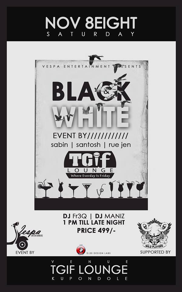 VESPA ENTERTAINERS PRESENTS BLACK AND WHITE. TIME;1 PM ONWARDS VENUE:TGIF LOUNGE PRICE:499 for ticket contact: Sabin Shahi(9803289995) Santoss C-resta(9813512229) Rejin Maharjan(9849132221)..