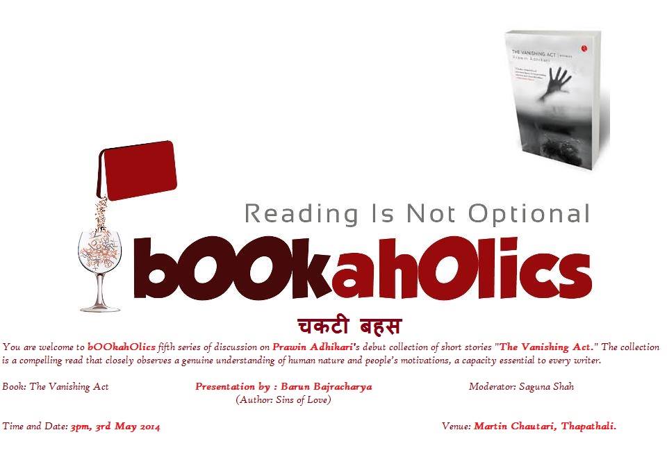 You are welcome to our fifth series of discussion. In this session Barun Bajracharya , author of 'Sins of Love' will be sharing his views on Prawin Adhikari's compelling collection of short stories "THE VANISHING ACT." We have been organizing the 'चकटी बहस' series every first Saturday of the English month and you do not have to go through any formal procedure to be a part of this discussion. Of course if we come after reading the book, the open floor discussion that follows the presentation will be even livelier. Let's be a part of such discussions and develop reading culture with the communitas of readers.