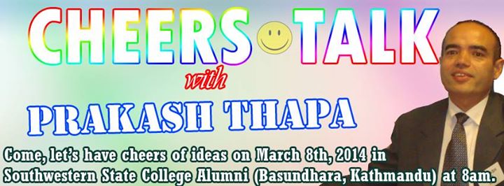 We invite you to the Cheers Talk, where Innovators gather and network at Southwestern State College Basundhara Kathmandu hall, @ 8 am on Saturday, March 8th, 2014. Mark your calendar now.