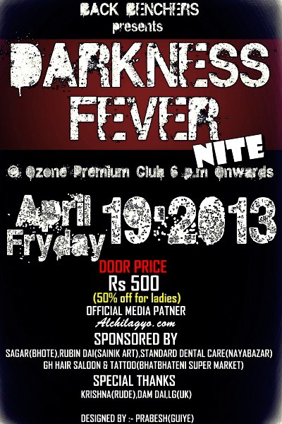 Darkness Fever Nite @ Ozone Premium club 6 pm onward April 19 2013 Friday Door Price: Rs 500 (50% off for ladies)Ticket Sponser -: Sagar ( Bhote ) Special Thanks -: L.G (U.K) GH Hair Saloon & Tattoos Media Partner -: Alchilagyo.com # Ticket Prices# *Rs 200* *RS 300* *Rs ..