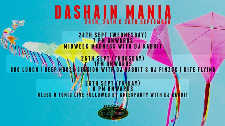 Dashain Mania at Brian's Grill House 24th Sept (Wednesday) Starts from 7 Pm - Midweek Madness 25th Sept (Thursday) Starts from 1 Pm - Kite Flying | BBQ Lunch | Cocktails | Deep House Session 26th Sept (Friday) Starts from 6 Pm - Blues N Tonic Live Followed by After Party..