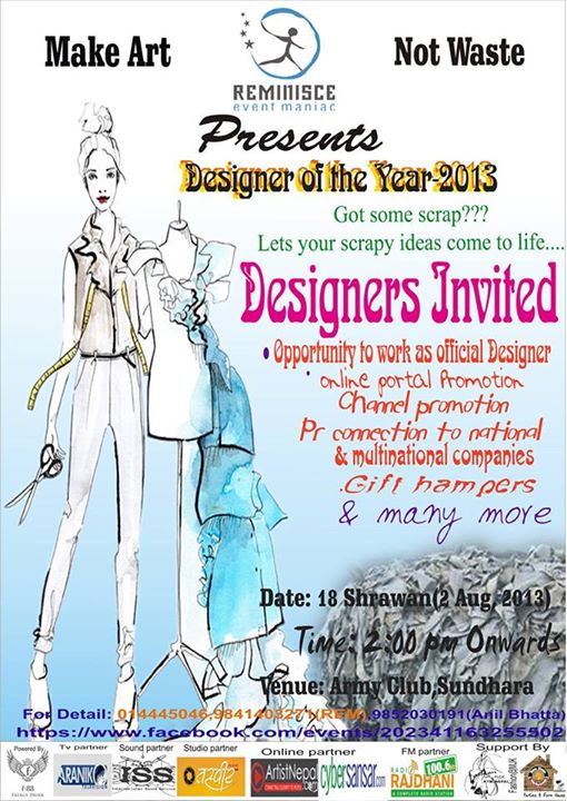 REMs next move ” De' DESIGNER OF THE YEAR 2013” an unique fashion event for the very first time in Nepal is not focused on fashion trend forecasting but on generating the creation and trying to energize designers being eco-friendly with the theme “ Make Art Not Waste ”. The event is scheduled to be host on 2nd Aug 2013( 18th Shrawan) @ Army Club,Sundhara. This is also an equal opportunity provider for aspiring fashion designers and models from all over Nepal with highly expertise along with best resources. This event is aimed to leave embarking impression in the history of fashion events. This event is not just concerned with the design of fabrics but with the varieties of 50 different waste materials which will be showcased by top models on the floor.