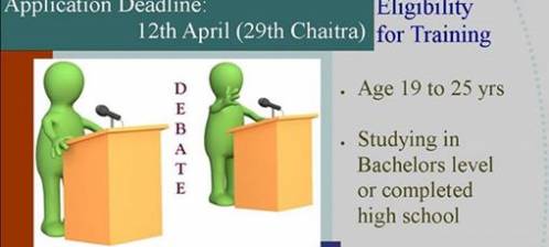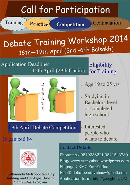 Debate Training Workshop 2014 is a training plus workshop organised by Kathmandu Metropolitan City (KMC) SamYuBaa (Sampada Ka lagi Yuba ra Balbalika) under building and heritage department of KMC with a motto to have debate on different issues.It is a three day workshop where Trainers and debate experts gives the idea and share knowledge of the every perspective of debate.