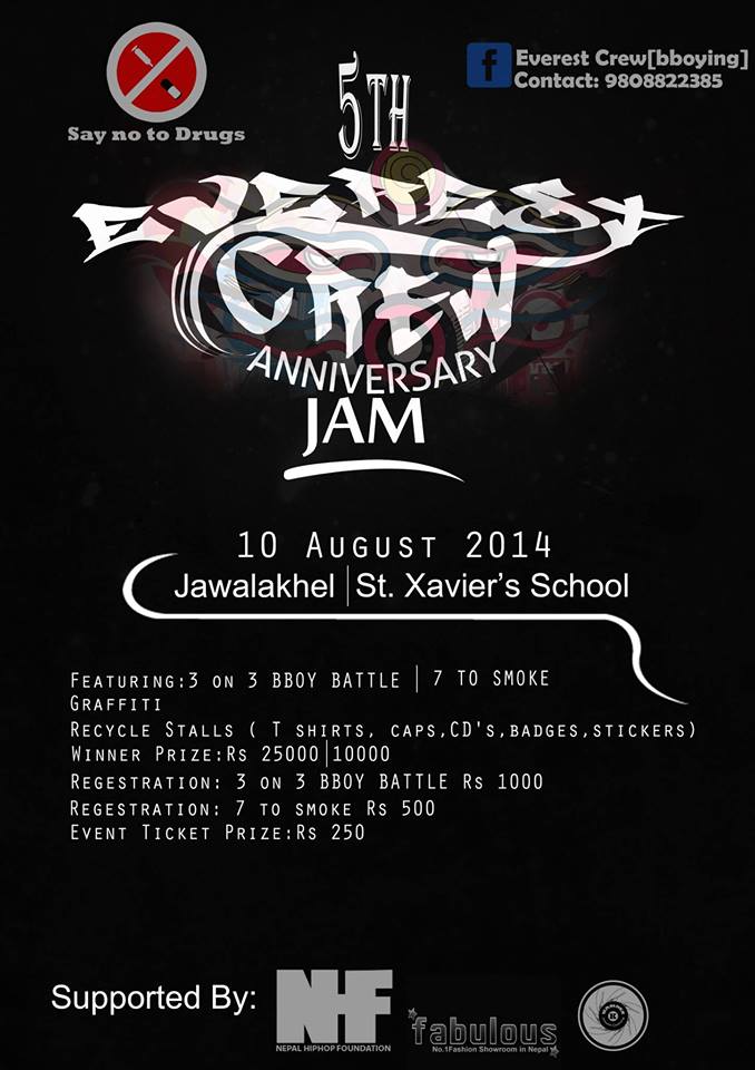 EVEREST JAM is an event done by Everest Crew in a yearly basis. This year we are celebrating our 5 years anniversary of Everest Crew. We try to bring all the bboys of Nepal and other countries together where they can have fun and share knowledge, experiences, problems. It basically help all the bboys to grow.