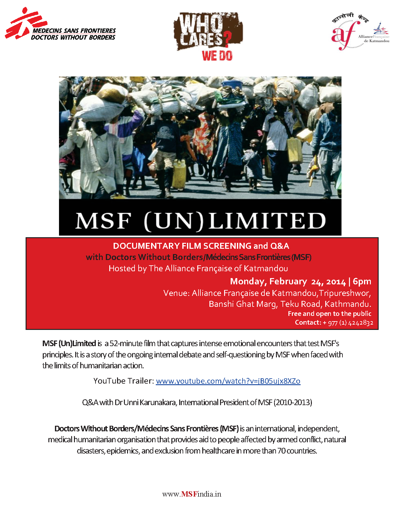 Free Film Screenings by Noble Peace Prize Recepient Doctors without Border/Médecins Sans Frontières (MSF)