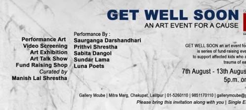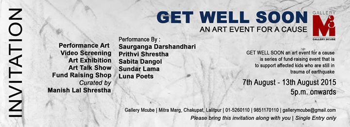 We have already organized get well soon project in various venues but now gallery alone is facing various obstacles in further events hence we are organizing this event to raise funds to support Get Well SOON Project which will include various art events such as art exhibition, painting sales of senior plus emerging artist, launching of souvenir shop to support the project, Art video screening, and most importantly performance art. The fund collected through the sale of tickets will directly support the GET WELL SOON Project.