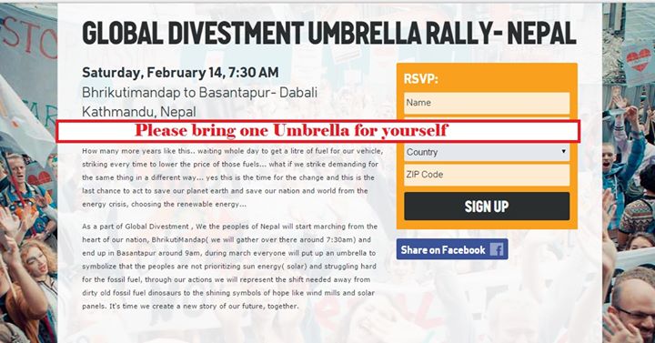 As a part of Global Divestment , We the peoples of Nepal will start marching from the heart of our nation, BhrikutiMandap( we will gather over there around 7:30am) and end up in Basantapur around 9am, during march everyone will put up an umbrella to symbolize that the peoples are not prioritizing sun energy( solar) and struggling hard for the fossil fuel, through our actions we will represent the shift needed away from dirty old fossil fuel dinosaurs to the shining symbols of hope like wind mills and solar panels. It's time we create a new story of our future, together.