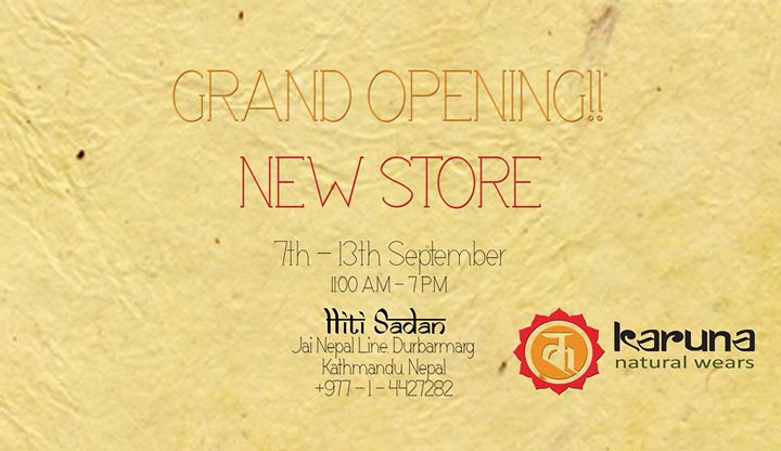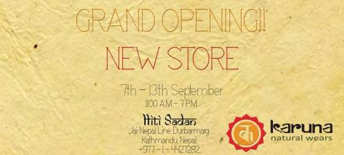 Karuna Natural Wears would like to cordially invite you to the Grand Opening of our new store in Hiti Sadan, Durbar Marg. Our opening week will run for a week from 7th September to 13th September between 11 a.m - 7 p.m.
