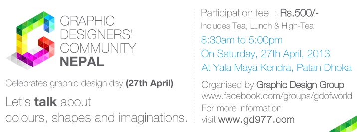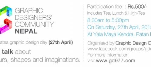 Graphic Designers’ Community Nepal celebrates graphic designers’ day (27th April). Let’s talk about colours, shapes and imaginations. Participation fee : Rs.500/- Includes Tea, Lunch & High-Tea Participation limit : 50 seats 8:30am to 5:00pm On Saturday, 27th April,..