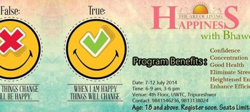 Happiness Program is a 6 days workshop of The Art of Living Date: July 7-12, 2014 Time: 6-9 am, 3-6 pm Venue: DECC, UWTC, Tripureshwor Contact: 9841146236, 9813138024, 9803199537, 9803572935 Register soon. Seats Limited...