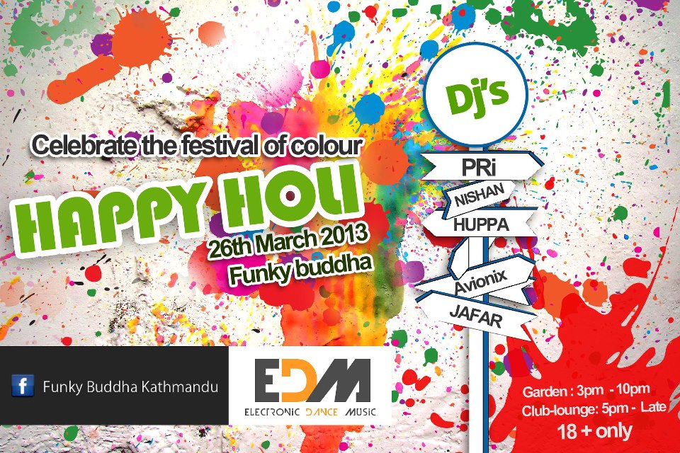 Come celebrate the festival of colors @ funky buddha kathmandu with the best dj's in town, who will be spinning some of the finest tunes in electronic dance music. Its gonna be a proper stomper make sure you are here for this..................... Dj's :- PRi Nishan Avionix Huppa..