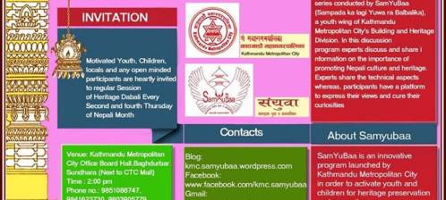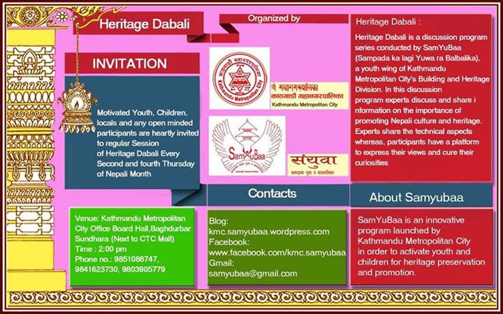 Heritage Dabali is a discussion program series conducted by SamYuBaa (Sampada ka lagi Yuwa ra Balbalika), a youth wing of Kathmandu Metropolitan City's Building and Heritage Division. In this discussion program experts discuss and share information on the importance of promoting Nepali culture and heritage. Experts share the technical aspects whereas, participants have a platform to express their views and cure their curiosities.