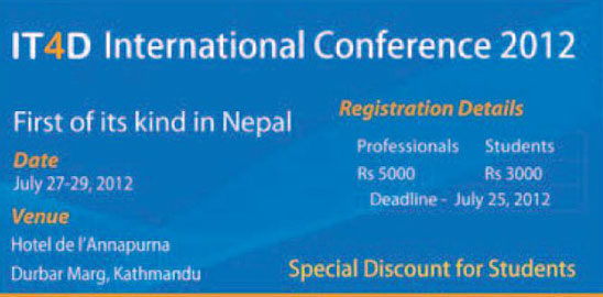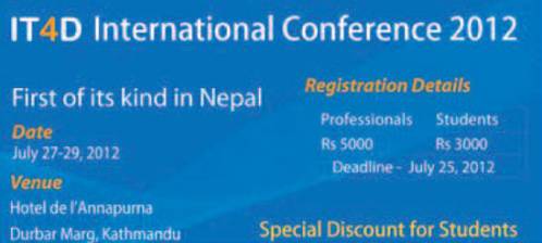 IT4D International Conference 2012 First of its kind in Nepal www.it4d.org Date July 27 - 29 July 2012 Venue: Hotel de l Annapurna Durbar Marg, Kathmandu