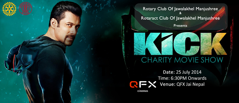 Rotary & Rotaract Club Of Jawalakhel Manjushree is organizing a charity film screening of movie ‘KICK’ in 25th July, 6:30PM at QFX Jai Nepal. The funds collected from the following event will be used for the benefits of underprivileged student of Shree Suryodaya Bal Bikash Primary School Imadol, Lalitpur.