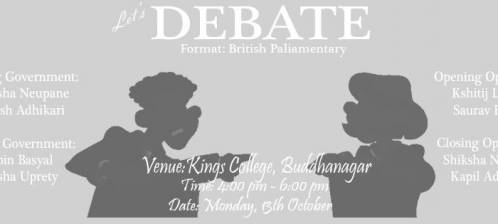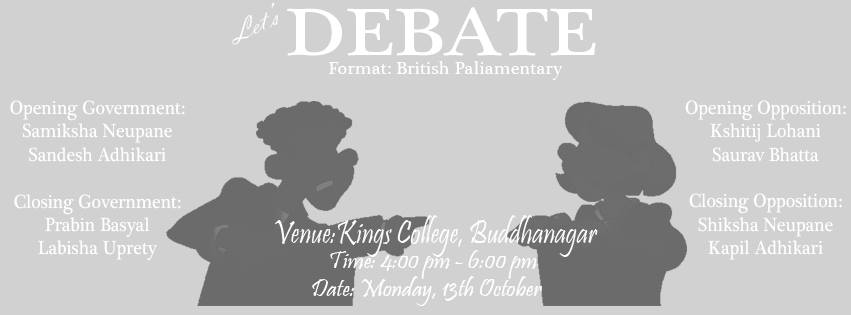 In order to add to the debating culture in Nepal, a debate session with very experienced debaters of the country will be held at Kings College, this Monday - 13th October. The format of the debate is British Parliamentary, which is a pioneer worldwide acclaimed debating format. So, if you are interested to enhance your debating skills, or even witness the way the young people are debating, do be a part of this event.