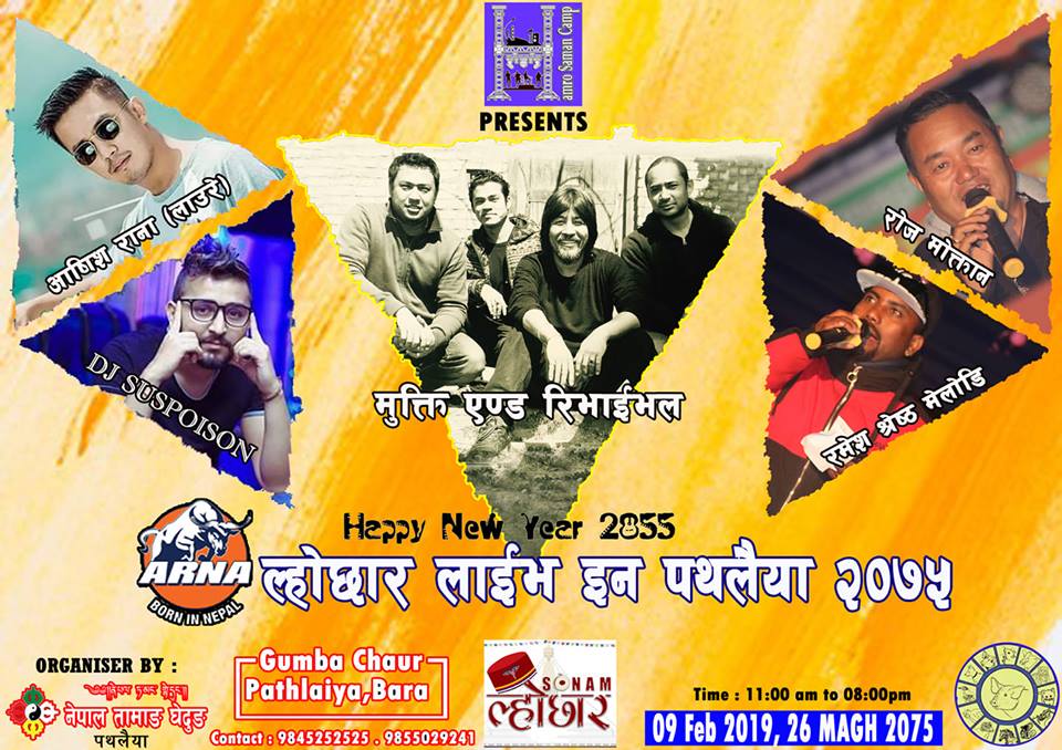 तामाङ जातिहरुको नयाँ बर्ष २८५५ (फग डग), सोनाम ल्होछारको पावन अवसरमा हाम्रो समन क्याम्प प्रस्तुत गर्दछ । अर्ना "ल्होछार लाईभ इन पथलैया २०७५" कलाकारहरु : मुक्ति एण्ड रिभाईभल ब्याण्ड, आषिस राना (लाउरे), रोज मोक्तान, रमेश श्रेष्ठ मेलोडी आयोजक : नेपाल तामाङ घेदुङ पथलैया इभेन्ट अर्गनाइज : हाम्रो समन क्याम्प मिति : २०७५ माघ २६ गते (09 Feb 2019) समय : औपचारिक कार्यक्रम बिहान ०१:०० बजे देखि ०३:०० बजे सम्म, लाईभ इन कन्सर्ट : दिउँसो ०३:०० बजे देखि ०८:०० बजे सम्म स्टेज : हाम्रो समन क्याम्प,सिमरा साउण्ड : स्काई साउण्ड सिस्टम,काठमाडौ