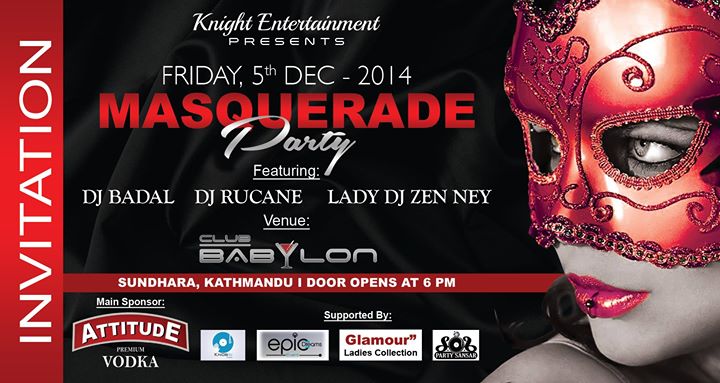 Knights Entertainment presents Masquerade Party @ New ClubBabylon Dj:-Dj Badal Dj Rucane #Dj Zen Ney(Ladies) Main Sponcer by:- My NEPAL My Attitude Vodaka Supported by:- Knob Dj School,ECP Dream,New Club Babylone Date: Dec 5 Friday Time:7pm Onwards Venue:Babylone..