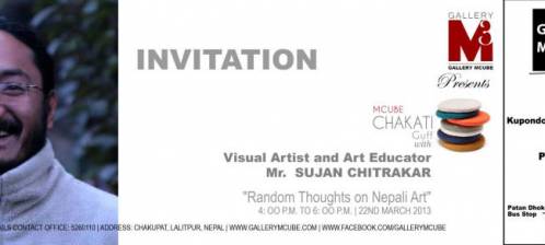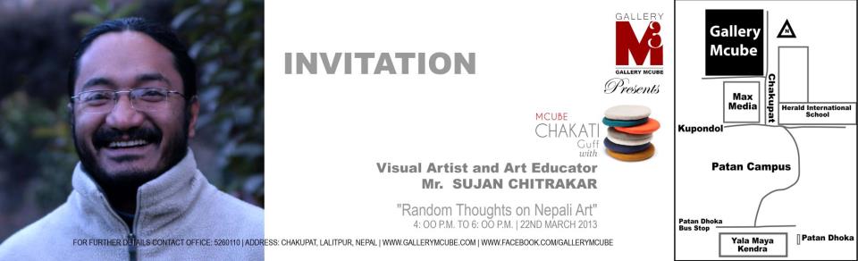 Gallery Mcube cordially invites you to the Talk Series MCUBE CHAKATI-GUFF "Random thoughts in Nepali Art" Talk and Presentation by Visual Artist and Art Educator Mr. Sujan Chitrakar On 22th March , 2013, Friday at 4:00 P.M. to 6 P.M. Venue: Chakupat, Lalitpur, Nepalwww.gall..