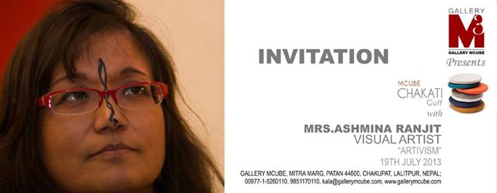 INVITATION Gallery M-Cube cordially invites you to the Talk Series MCUBE CHAKATI-GUFF “ARTIVISM” Talk and Presentation by VISUAL ARTIST MRS. ASHMINA RANJIT On 19th JULY, 2013, Friday At 4:00 P.M. to 6 P.M. Venue: Chakupat, Lalitpur, Nepal..