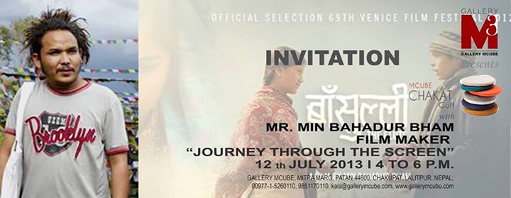INVITATION Gallery M-Cube cordially invites you to the Talk Series MCUBE CHAKATI-GUFF JOURNEY THROUGH THE SCREEN” Talk and Presentation by FILM MAKER MR. MIN BAHADUR BHAM On 12th JULY, 2013, Friday At 4:00 P.M. to 6 P.M. Venue: Chakupat..