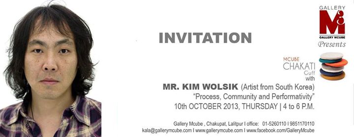 INVITATION Gallery M-Cube cordially invites you to the Talk Series MCUBE CHAKATI-GUFF "PROCESS, COMMUNITY AND PERFORMATIVITY” Talk and Presentation by ARTIST FROM SOUTH KOREA MR. KIM WOLSIK On 10TH OCTOBER, 2013, Thursday At 4:00 P.M. to 6 P.M. Venue: Chakup..