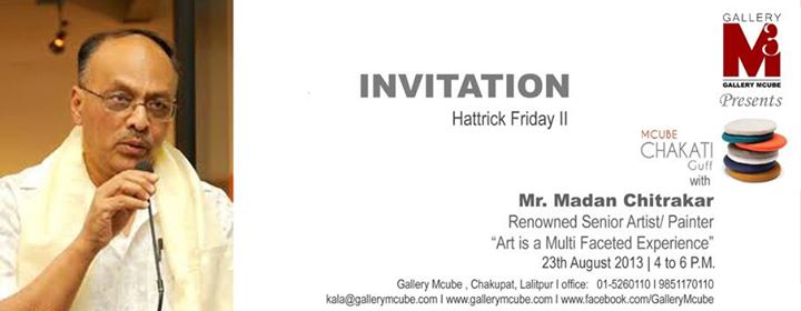 INVITATION Gallery M-Cube cordially invites you to the Talk Series MCUBE CHAKATI-GUFF “Art is Multi Faceted Experience" Talk and Presentation by Artist/ Painter/ Writer Mr. Madan Chitrakar On 23th AUGUST, 2013, Friday At 4:00 P.M. to 6 P.M. Venue: Chak..