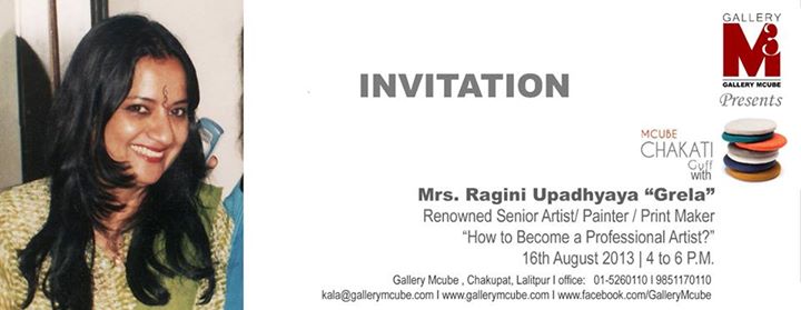 INVITATION Gallery M-Cube cordially invites you to the Talk Series MCUBE CHAKATI-GUFF “How to become a Professional Artist?" Talk and Presentation by RENOWNED SENIOR ARTIST/ PAINTER/ PRINT MAKER MR. RAGINI UPADHYAYA "GRELA" On 16th AUGUST, 2013..