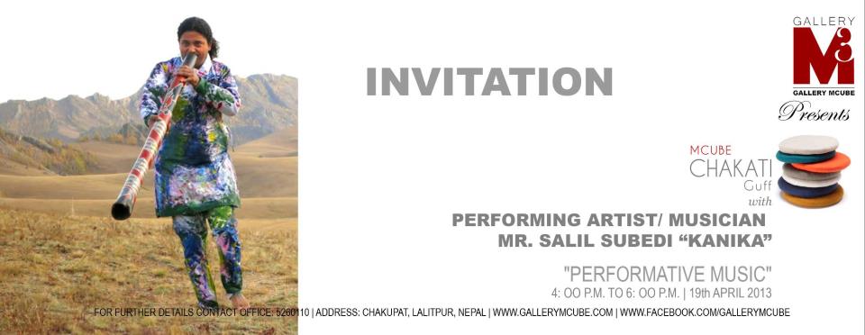 INVITATION Gallery Mcube cordially invites you to the Talk Series MCUBE CHAKATI-GUFF “PERFORMATIVE MUSIC†by PERFORMING ARTIST/ MUSICIAN MR. SALIL SUBEDI "KANIKA" On 19th April, 2013, Friday at 4 P.M. to 6 P.M. Venue: Chakupat, Lalitpur, Nepal ..