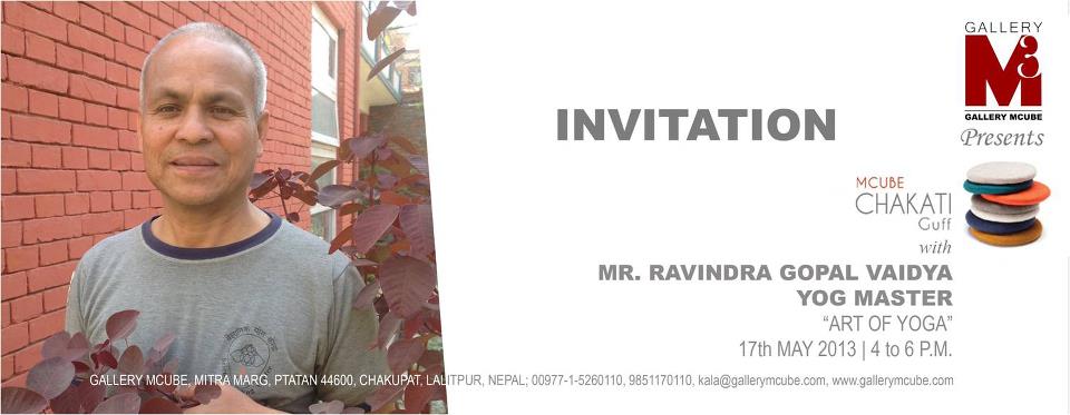 INVITATION Gallery M-Cube cordially invites you to the Talk Series MCUBE CHAKATI-GUFF "ART OF YOGA†Talk and Presentation by YOG GURU FROM SCIENTIFIC YOG CENTER MR. RAVINDRA GOPAL VAIDYA On 17th MAY, 2013, Friday At 4:00 P.M. to 6 P.M. Venue..