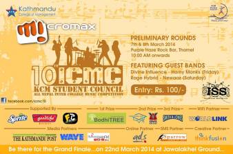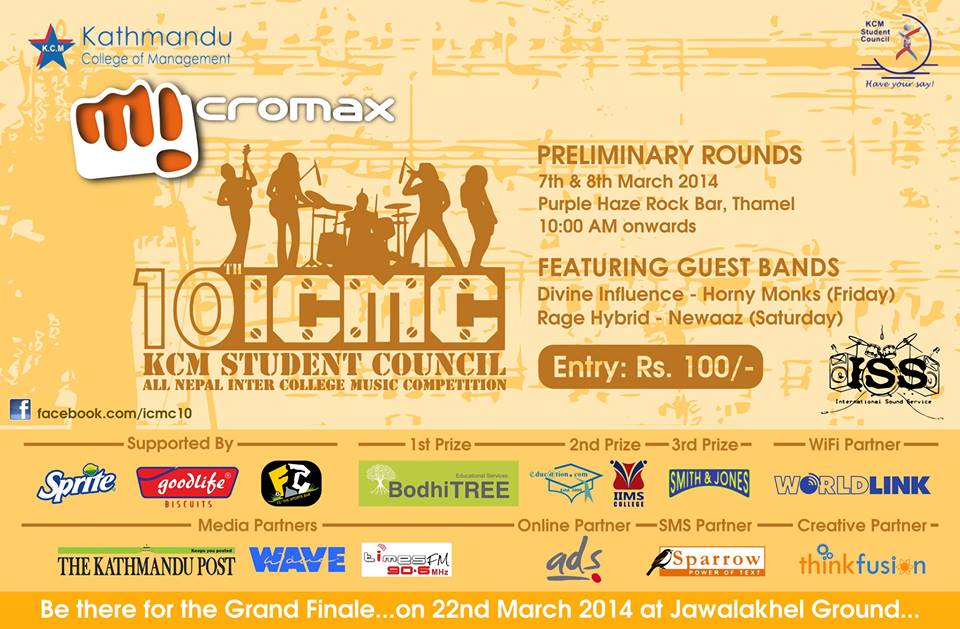 The Student Council of Kathmandu College of Management (KCM) is proud to present its annual All Nepal Inter College Music Competition which will be taking place in Maqrchr this year. Currently in its 10th year, we promise to make the show bigger, louder and heavier with industry leading lights and sound setups. It'll be a concert experience like you've never known before. So get ready for some heart pounding live music!