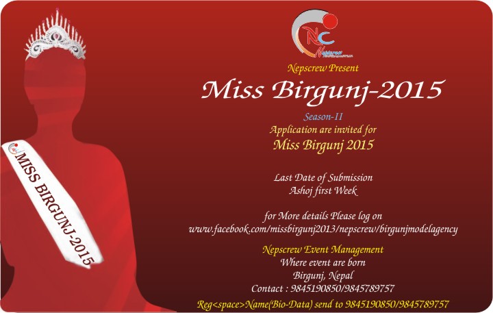 For more details, please log on to www.facebook.com/missbirgunj2013/nepscrew/birgunjmodelagency