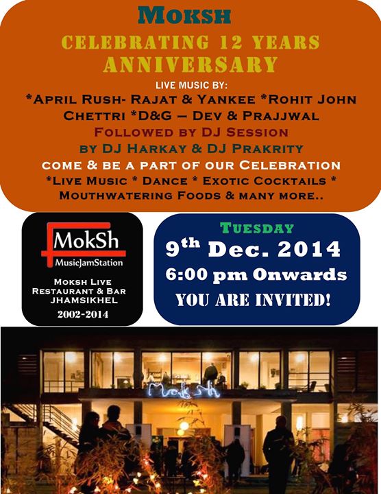 9th Dec. 2014 / 6:00pm Onwards. Moksh Celebrating its 12 years Anniversary & entering the teenage years ! ;) Live Music by : *April Rush - Rajat & Yankee *Rohit John Chettri * D&G - Dev & Prajwal. Followed by DJ Session by DJ Harkay & DJ P..