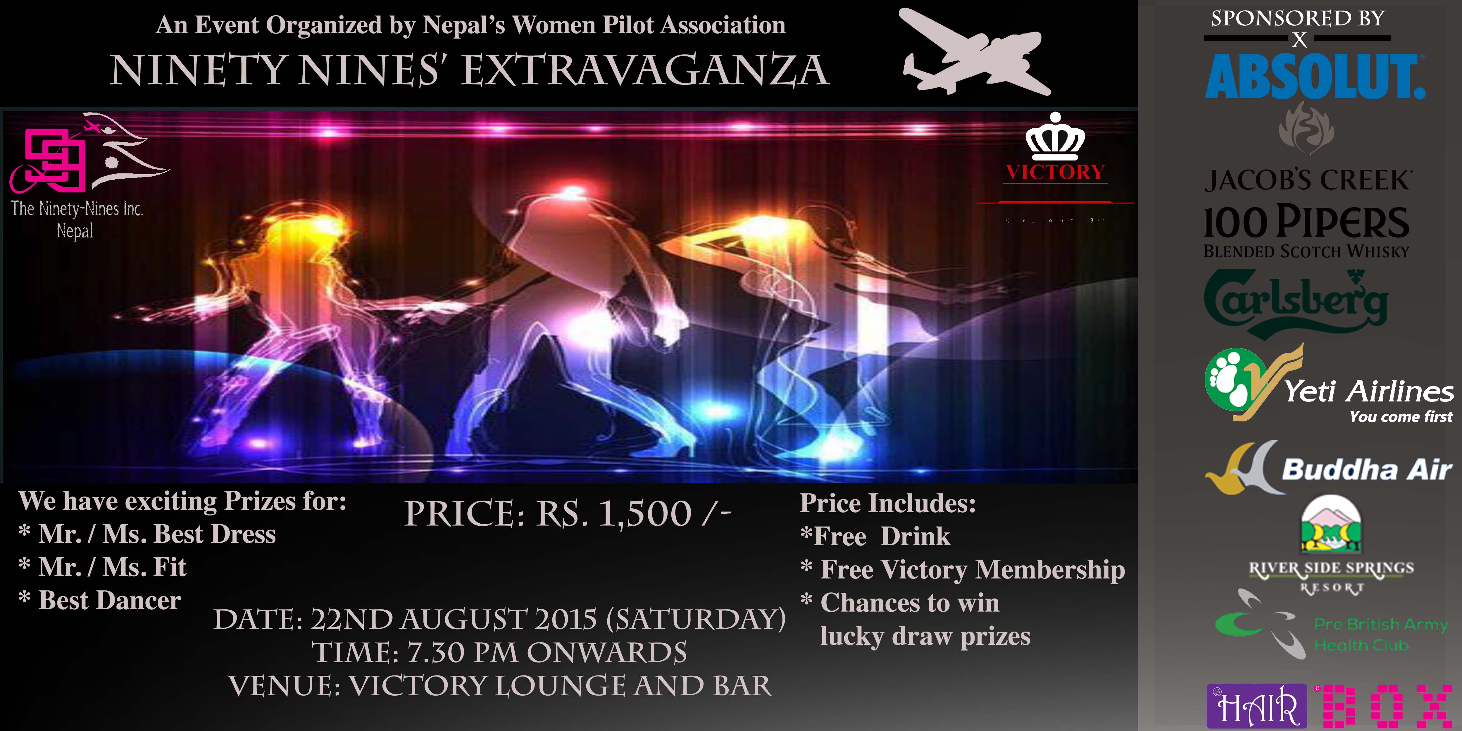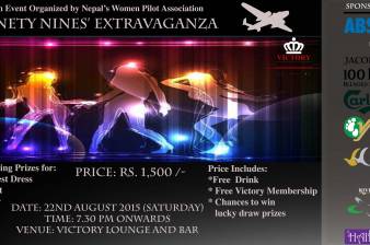 Welcome to “Ninety Nines Extravaganza”; an event organized by Ninety Nines Inc. International Organization of Women Pilots Nepal Section! Music, drinks,snacks, dance, bright lights, friendship, unity, fun, all under the same roof! A shout out to all the dance enthusiasts in Kathmandu city to the hottest dance party this summer, 2015. Party till you drop with a live band and the Hottest DJs on the decks, and the coolest aviation flock of the country! Come join us to chill, relax and party all night. Surprise lucky draw Mystery prizes up for grabs on the night