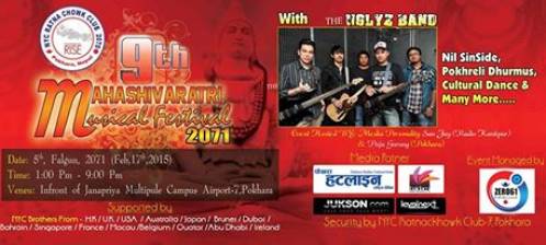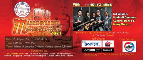 Like Every Year This Time also NYC RATNA CHOWK CLUB,Pokhara Gonna Organize 9th MahaShivaRatri Musical Festival with Various Artists.. And this time to convert Pokhara into a Melodious place we gonna bring the UGLYZ band who made us crazy by their Songs like Aaudai Jadai Garnu Yo Jivan, sathi and many more... Pokhara"s 1 of the top Metal Rock Band NIL SINSIDE also Gonna Perform and the entire event will be hosted by Media Personality San Jay( Radio Kantipur) and Pooja Grg from Pkr... The event will also Feature Cultural Dances and many more surprises..