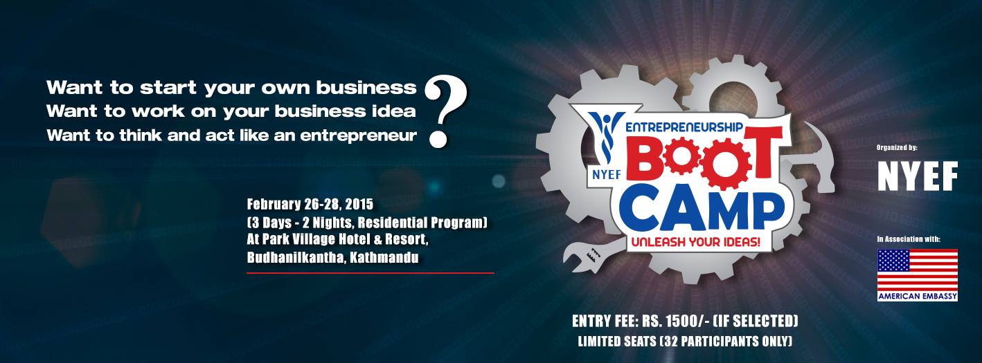 The Nepalese Young Entrepreneurs’ Forum (NYEF) in association with the US Embassy is organizing two three-day residential entrepreneurship boot camps within September 2015. There will be a total of 32 participants in each boot camp.