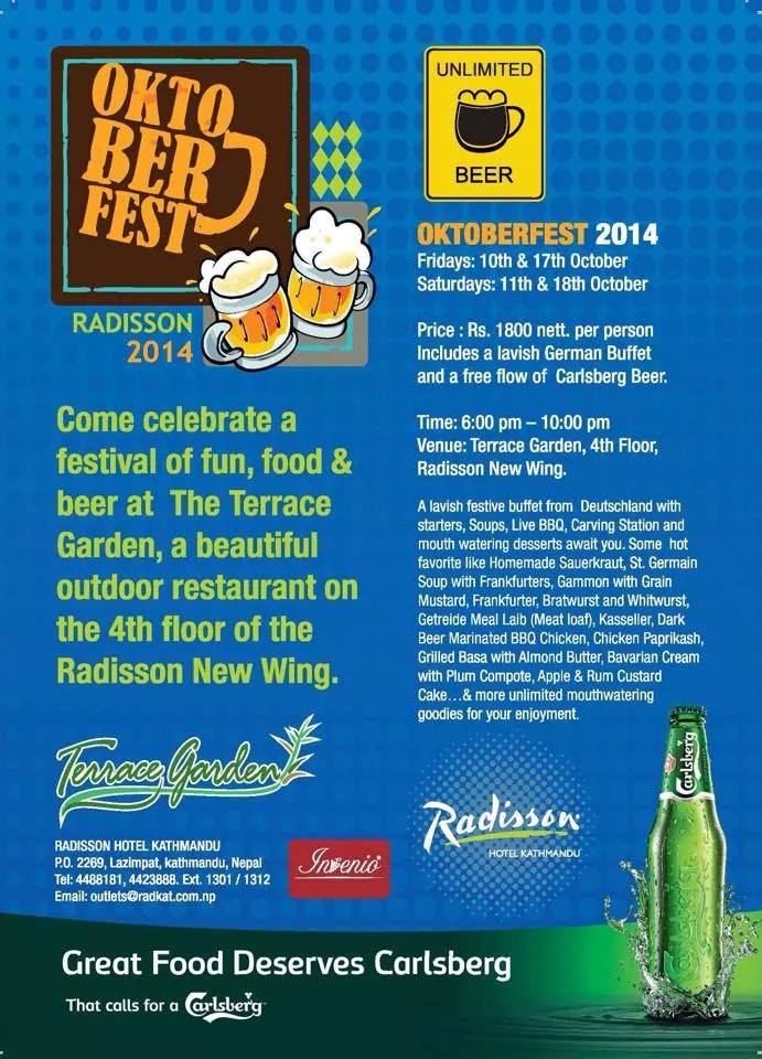 Oktoberfest at Radisson Hotel Kathmandu Terrace Garden - October 10 & 11 and October 17 & 18. Celebrate the festival in German way with German feat and unlimited Carlsberg !! For more information please call 4411818 Ext. 1312 / 1301..