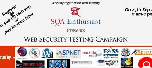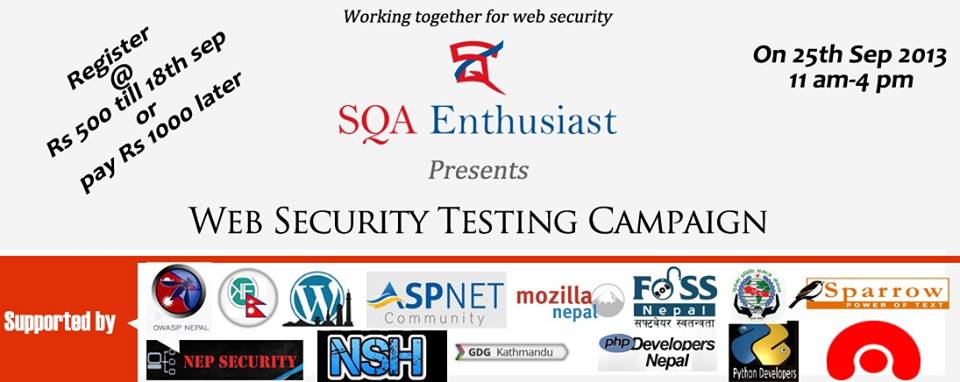 It is one of the events of web security testing campaign which has been going on since last 2 months, This conference is organized by Sqa Enthusiast. This program is supported by these communities PHP Developers Nepal ASP.NET Community WordPress Nepal ITS Nepal Nite Shadow Hack (NSH) Nep_Security OWASP Nepal Chapter @okfnepal FOSS Nepal Community