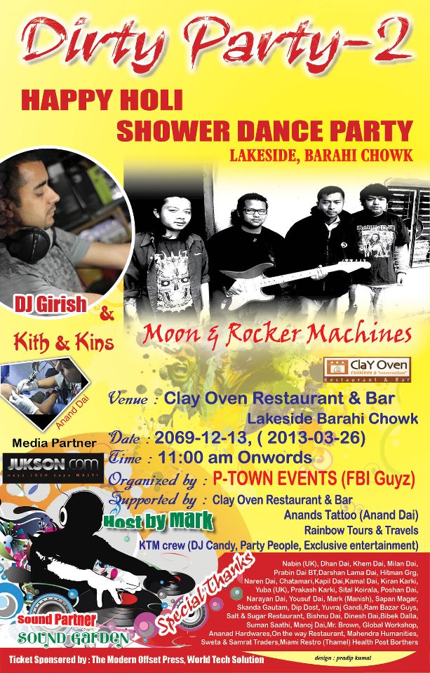 P Town Events PARTY PEOPLE EXCLUSIVE EVENT Presents: SHOWER DANCE PARTY (DIRTY PARTY -2 ) LIVE MUSIC AND DANCE PARTY ,TRANC MUSIC WITH DJ GRISH N Dj CANDY from KTM HOLI CELEBRATION VENUE : CLAY OVEN RESTAURANT AND BAR, BARAHI CHOWK LAKESIDE DATE: 2..
