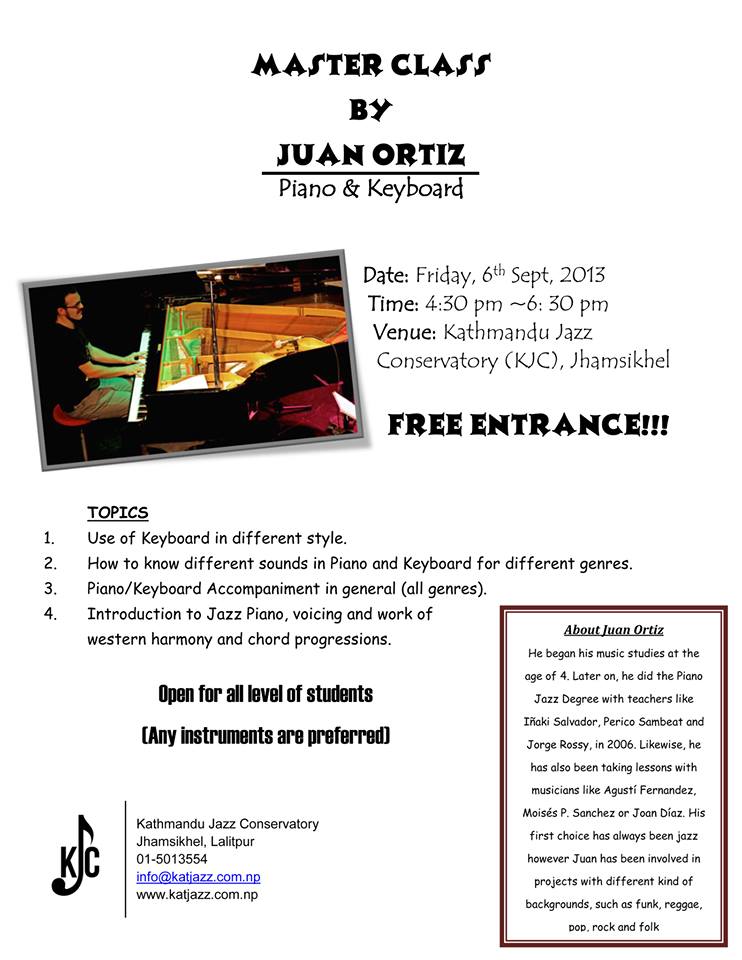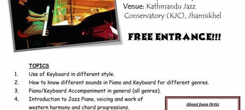 Free Master Class by Juan Ortiz on Piano and Keyboard. Open for all level of students (any instruments are prefered) Topics to be covered: 1. Use of Keyboard in different style 2. Knowing different sounds in Piano and Keyboard for different genres 3. Pian..